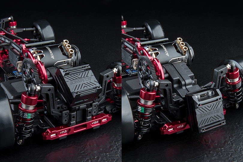 -Aluminum motor mount with 4-step height adjustment for precise center-of-gravity tuning.