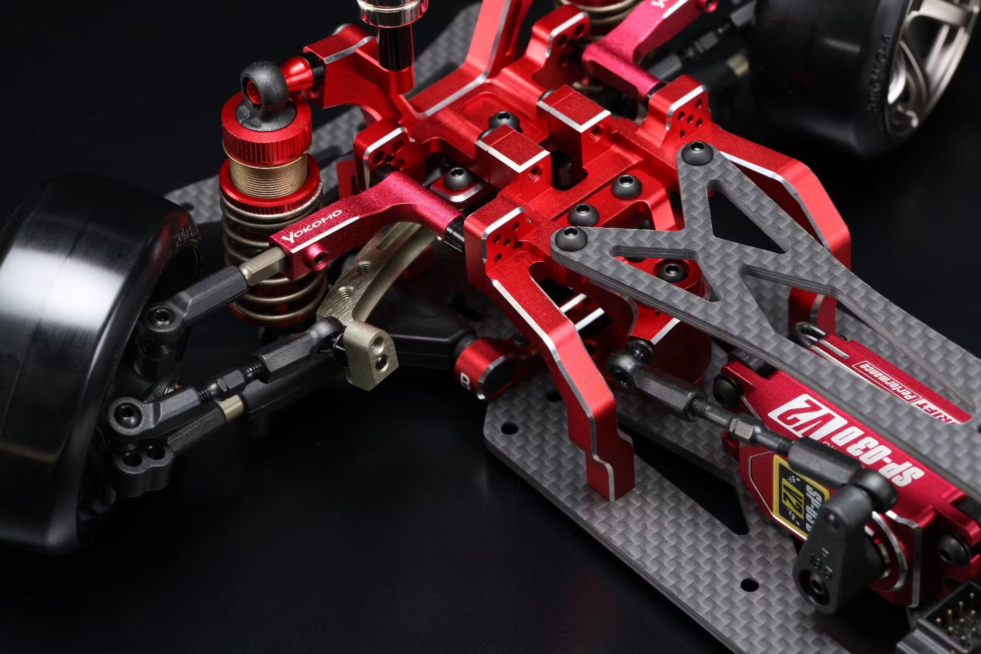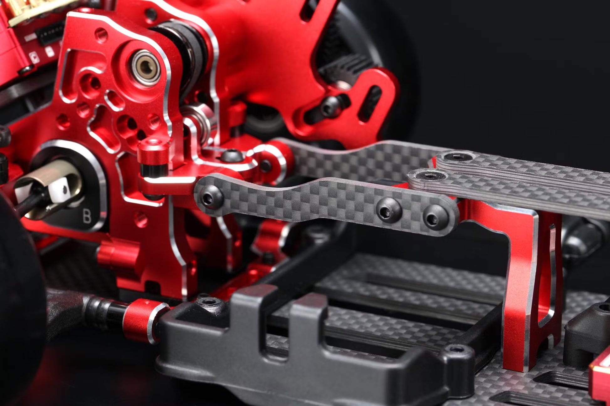 The rigidity of the front end increases the surface pressure on the front tires, which enhances controllability when exiting corners. Both front and rear suspension arms are suspension pin type H-arms, but they can also be changed to the conventional MD series A-arms, and